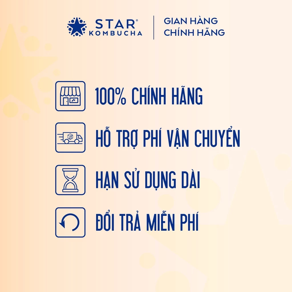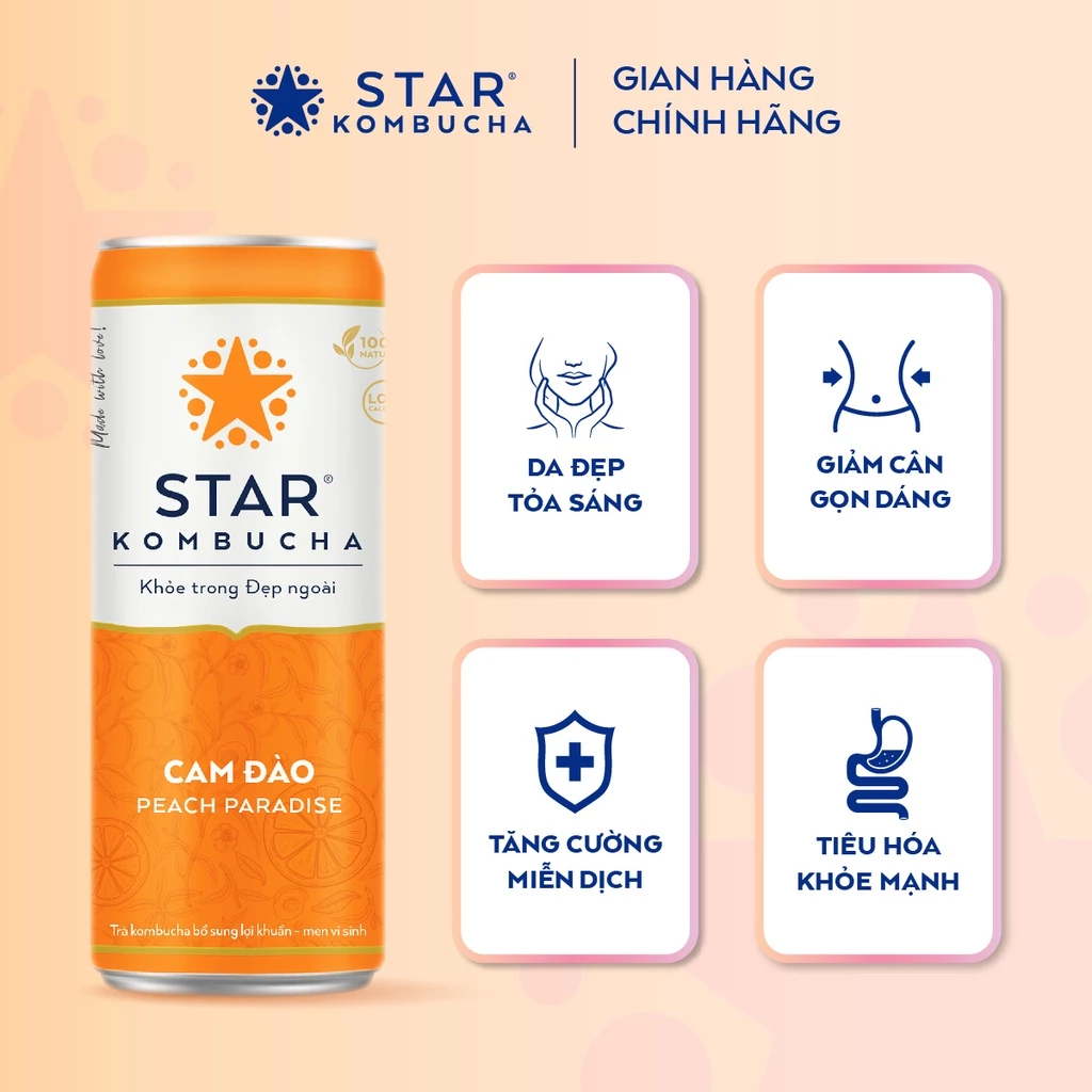 STAR KOMBUCHA là thương hiệu Kombucha đầu tiên tại Việt Nam, được sản xuất theo tiêu chuẩn và công thức Hoa Kỳ, được chứng nhận bởi FDA. Với 100% thành phần tự nhiên từ trà, men Scoby, trái cây và thảo mộc thiên nhiên, STAR KOMBUCHA giúp tăng cường miễn dịch, bảo vệ hệ tiêu hóa, hỗ trợ giảm cân và nhiều lợi ích khác đối với sức khỏe.