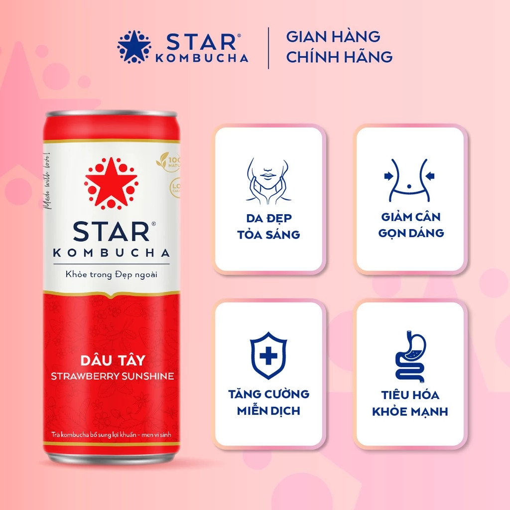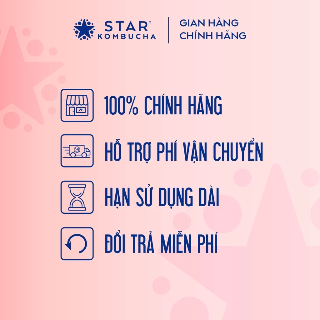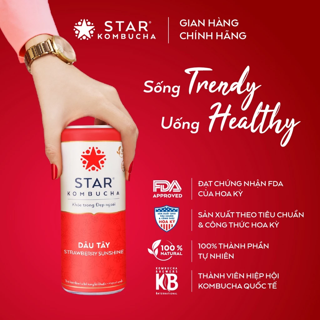 STAR KOMBUCHA là thương hiệu Kombucha đầu tiên tại Việt Nam, được sản xuất theo tiêu chuẩn và công thức Hoa Kỳ, được chứng nhận bởi FDA. Với 100% thành phần tự nhiên từ trà, men Scoby, trái cây và thảo mộc thiên nhiên, STAR KOMBUCHA giúp tăng cường miễn dịch, bảo vệ hệ tiêu hóa, hỗ trợ giảm cân và nhiều lợi ích khác đối với sức khỏe.