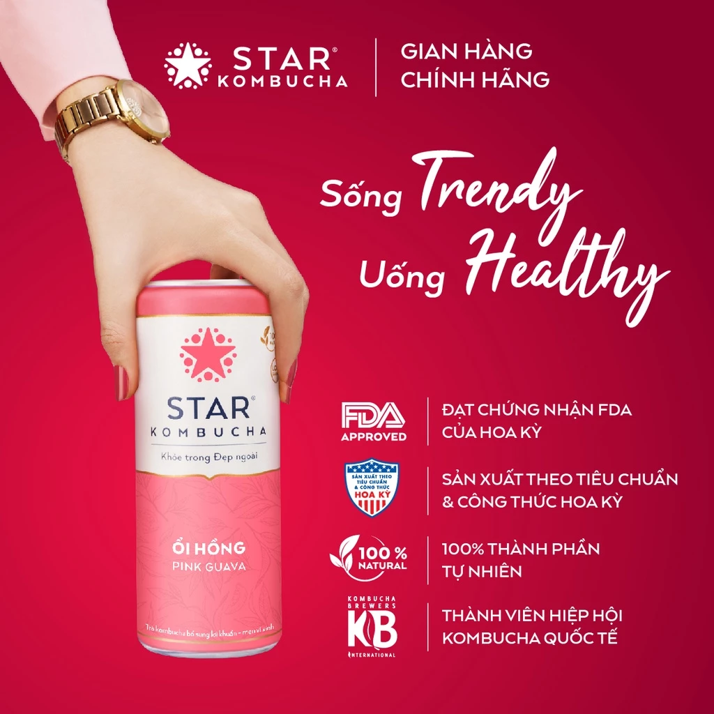 STAR KOMBUCHA là thương hiệu Kombucha đầu tiên tại Việt Nam, được sản xuất theo tiêu chuẩn và công thức Hoa Kỳ, được chứng nhận bởi FDA. Với 100% thành phần tự nhiên từ trà, men Scoby, trái cây và thảo mộc thiên nhiên, STAR KOMBUCHA giúp tăng cường miễn dịch, bảo vệ hệ tiêu hóa, hỗ trợ giảm cân và nhiều lợi ích khác đối với sức khỏe.