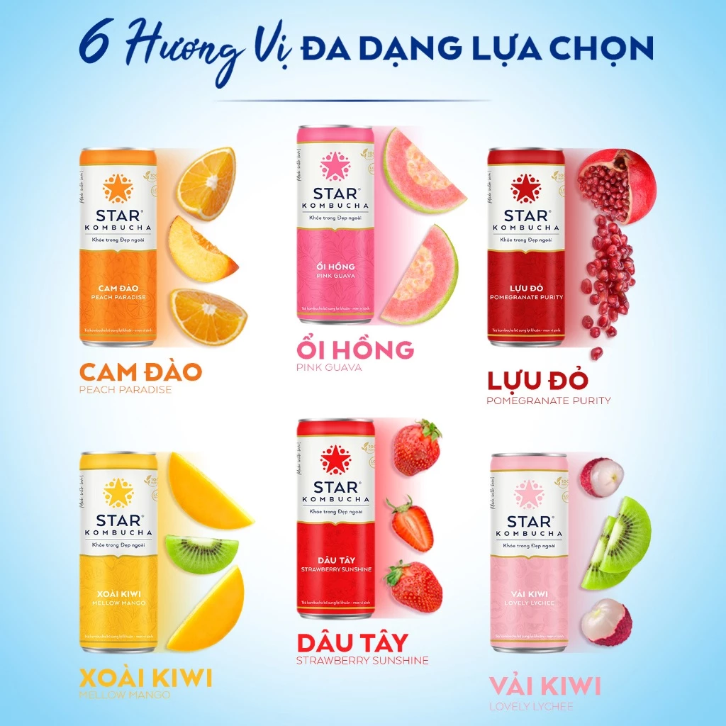 STAR KOMBUCHA là thương hiệu Kombucha đầu tiên tại Việt Nam, được sản xuất theo tiêu chuẩn và công thức Hoa Kỳ, được chứng nhận bởi FDA. Với thành phần tự nhiên từ trà, men Scoby, trái cây và thảo mộc thiên nhiên, STAR KOMBUCHA giúp tăng cường miễn dịch, bảo vệ hệ tiêu hóa, và nhiều lợi ích khác đối với sức khỏe.