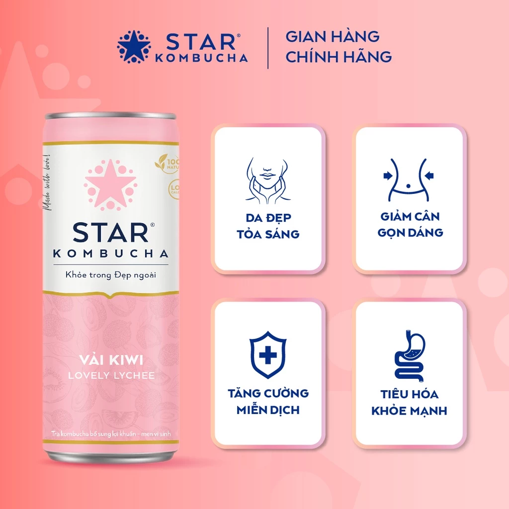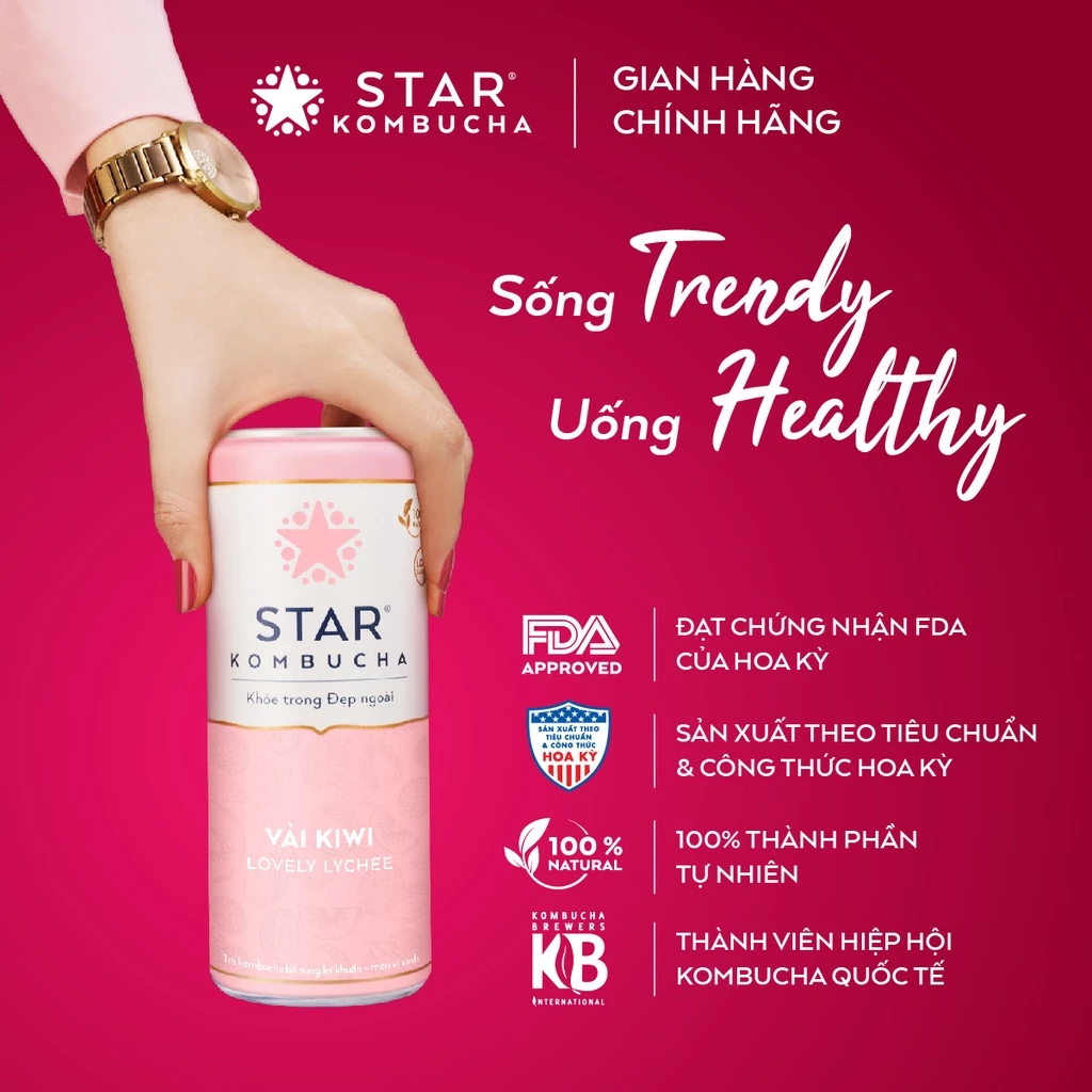 STAR KOMBUCHA là thương hiệu Kombucha đầu tiên tại Việt Nam, được sản xuất theo tiêu chuẩn và công thức Hoa Kỳ, được chứng nhận bởi FDA. Với 100% thành phần tự nhiên từ trà, men Scoby, trái cây và thảo mộc thiên nhiên, STAR KOMBUCHA giúp tăng cường miễn dịch, bảo vệ hệ tiêu hóa, hỗ trợ giảm cân và nhiều lợi ích khác đối với sức khỏe.