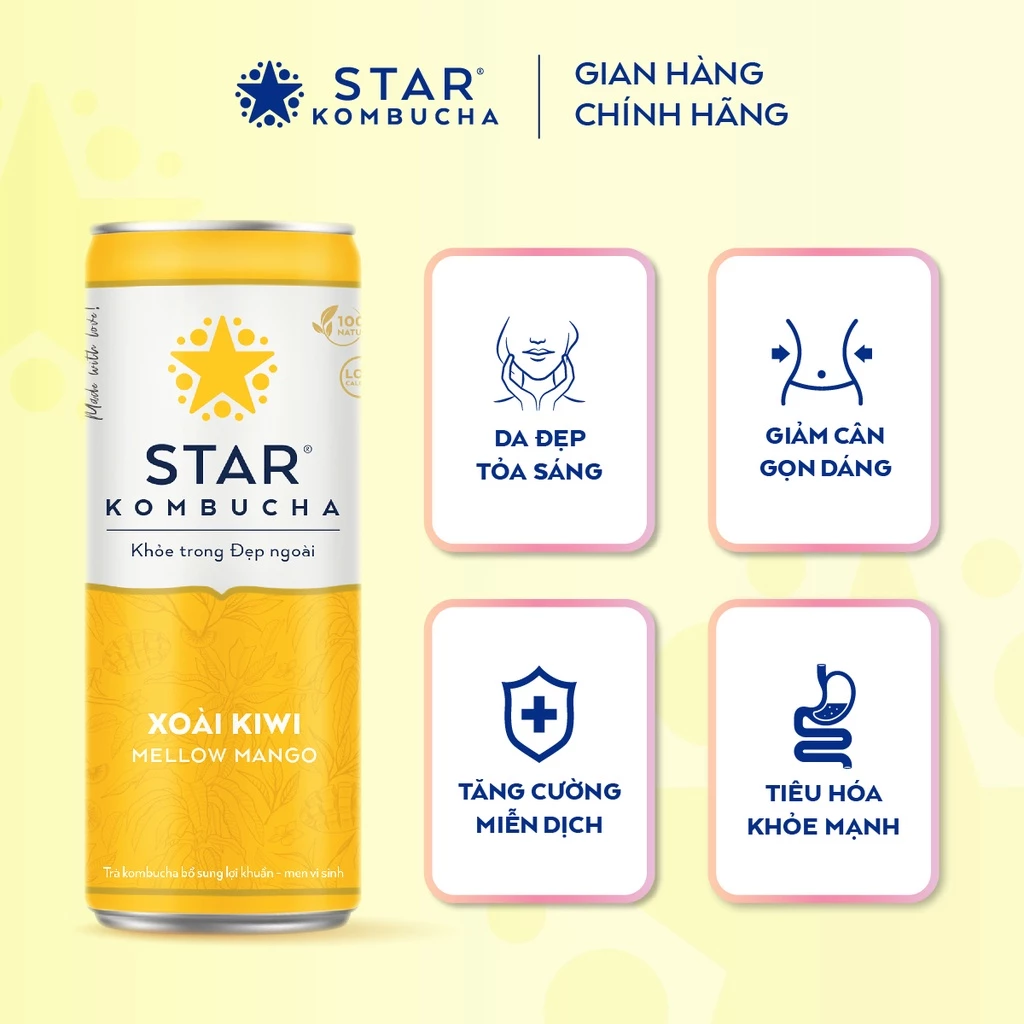 – Hương vị: Trà Kombucha hữu cơ vị Xoài Kiwi / Mellow Mango chua thanh và ngọt nhẹ nhàng.